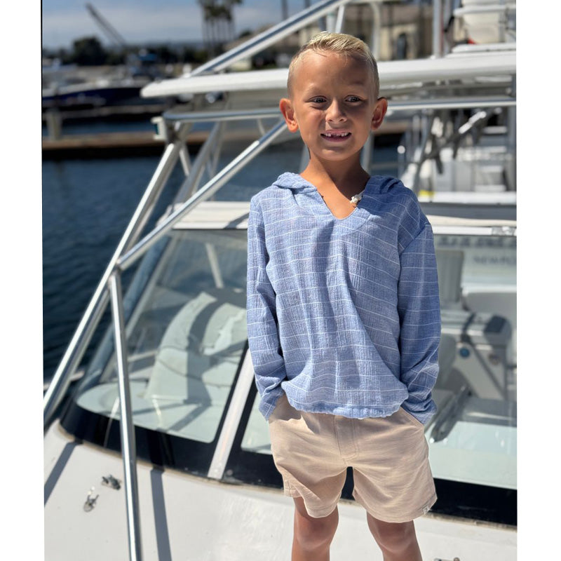 Love the color!! Chambray blue and white textured stripe hooded top.