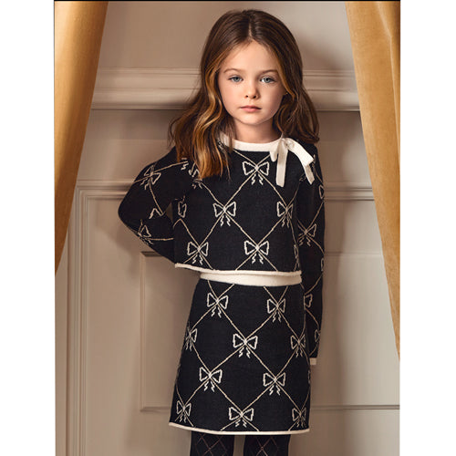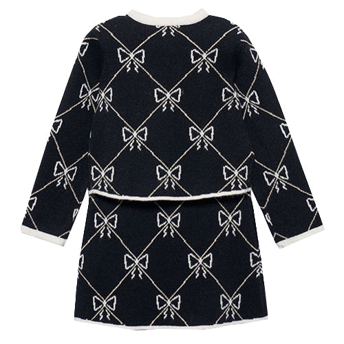 So soft, cozy and cute!! This warm, cozy, and stylish black knit sweater with ivory festive bows and bow detail at neckline and a shimmer of gold thread running thru lattice design is perfect for any shopping spree, lunch with grandmother, going to church or festive party. Matching skirt completes her adorable outfit.