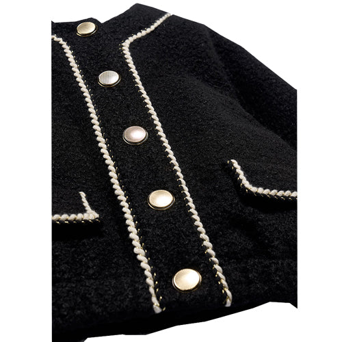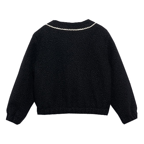 Bows!! Black sequin bow adorns the front of this ivory sweater with black knitting detail...