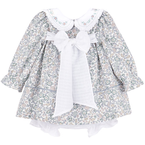 So cute!! Marigold floral dress in shades of marigold and steel blue on an ivory...