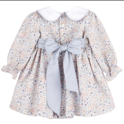 So cute!! Marigold floral dress in shades of marigold and steel blue on an ivory...